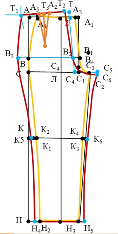 Бічну лінію задньої половинки штанів оформити через точки Т1, В3, К5, Н4.