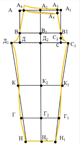 З’єднати точки Д1К, КН, С1К1, К1Н1 прямими лініями. В області стегна прогнути ці лінії під лекало, в області гомілки вигнути ці лінії під лекало.