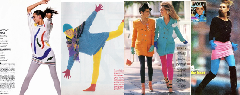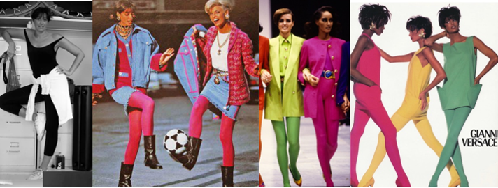 В 1985 році легінси нарешті з’являються на подіумах. Вперше – в колекції Донни Каран, через пару років в 1988 році – Карла Лагерфельда для будинку Chanel, на початку 90-х – у Versace (рисунок 1.4). Матеріали використовувалися синтетичні, кольори – максимально яскраві і блискучі. Епатажні знаменитості стали з’являтися на червоних килимових доріжках, зйомках кліпів і концертах саме в лосинах/легінсах. В Америці першою стала Мадонна (рисунок 1.5), а потім яскраві лосини стали візитною карткою модних «зірок». Далі почався справжній бум, недарма дев’яності роки асоціюють саме з різнокольоровими лосинами (фото з 90-х матеріальне підтвердження модних примх того часу). Вони дозволять підкреслити всі переваги фігури за рахунок своєї еластичності (рисунок 1.6).