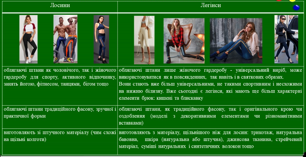 Легінси є різновидом лосин, відмінності між цими двома варіантами облягаючих штанів наведено в таблиці 1.2.