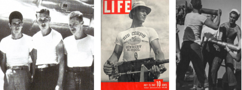 Основною перевагою цієї сорочки було те, що вона зшита з легкої тканини – бавовни. Остаточний вигляд вона мала такий: бавовняна сорочка вільного крою з коміром і з короткими рукавами. Її можна було одягнути як самостійну одиницю гардероба в жаркому кліматі, так і під низ верхнього одягу в холодному. T-shirt – саме таку назву отримала сучасна футболка в американській армії. В 1942 році в журналі «Life» опублікували фото військового в білій футболці з принтом, що призвело до несподіваної популярності даного виду одягу і в цивільного населення (рисунок 1.2).