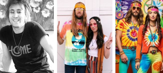 Пізніше, в 60-х з’явилися хіпі, які популяризували футболки з принтами, де висловлювали свої душевні емоції, політичні погляди або улюблену музику і кумирів. Тоді ж таки ввійшла в моду так звана футболка Tie-dye ( від “tie”– зав’язувати, крутити, а “dye” – фарбувати), яка асоціюється з етнічним стилем і субкультурою хіпі в цілому (рисунок 1.4)