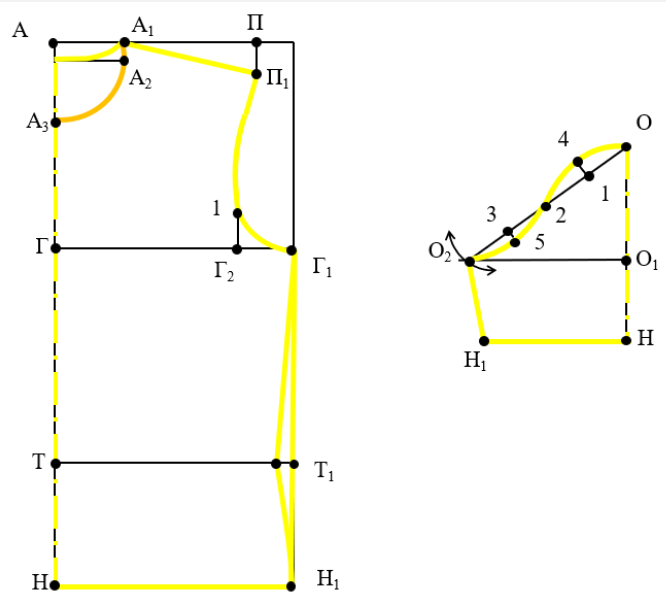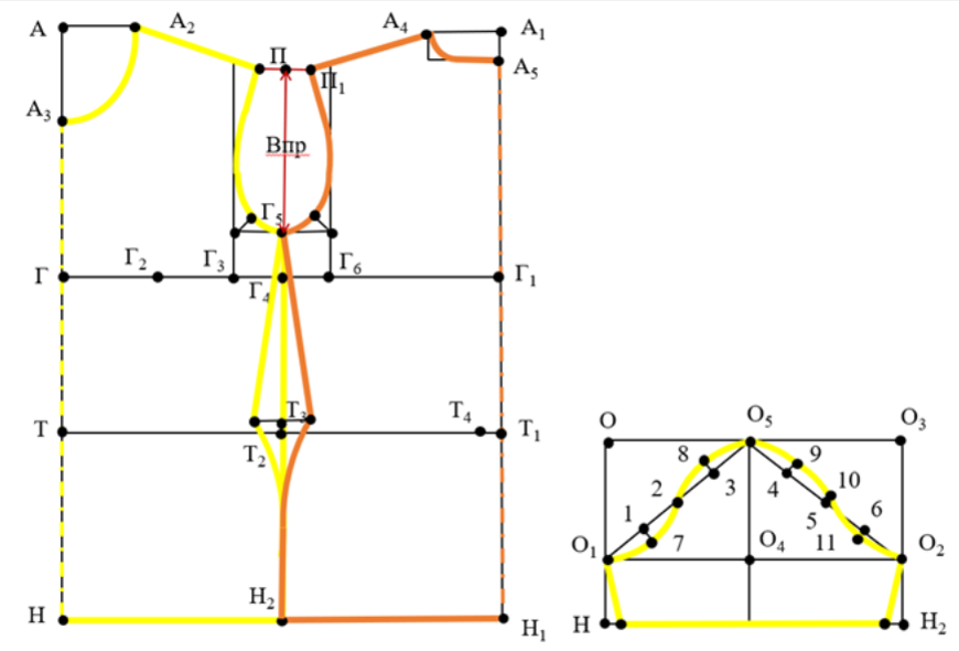 *k – коефіцієнт визначається як різниця між довжиною пройми переду та довжиною пройми спинки