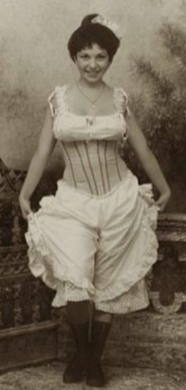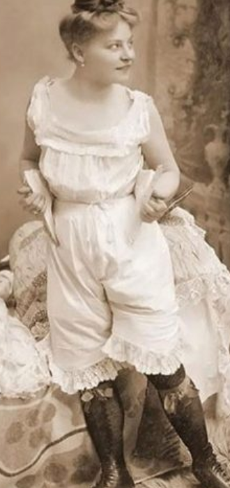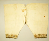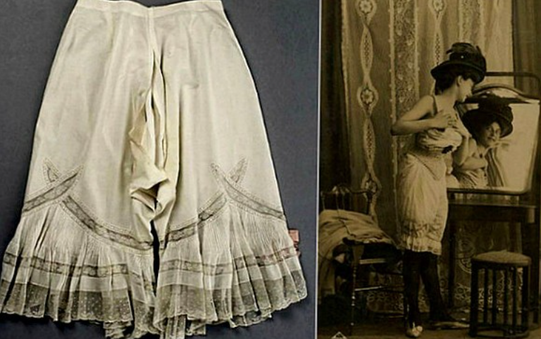 Але відомо і те, що в XVI столітті деякі італійські жінки все ж носили панталони : Елеонора Толедські (1522-1562) носила одну пару в 1561 році. Через півстоліття вже багато пар було виготовлено для Марії Медичі (1573-1642), яка була у той час новою королевою Франції. Жінки в Голландії також носили панталони, Морісон розповідає: «Деякі старші жінки, які не в силах переносити мороз, надягають знизу штани з льону або шовку». На посмертному зображенні Єлизавети I, зробленому в 1603 році, вона в корсеті і панталонах. До того ж є згадка про те, що у Єлизавети було «шість пар полотняних подвійних штанин з тонкої голландської тканини», зшитих в 1587 році. На початку XIX століття панталони остаточно утвердилися в жіночому гардеробі: оброблені мереживом, спочатку вони досягали щиколотки, а потім укоротилися до середини ікри. Відмітна особливість крою перших штанів — роздільні штанини, які кріпилися до поясу на талії, залишаючи шов на рівні промежини відкритим. У 1860-х роках панталони стали ще коротше і доходили тільки до колін (рисунок 2.8).