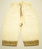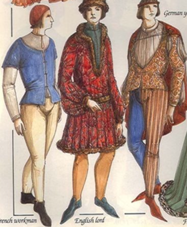 А от функцію чоловічої середньовічної натільної білизни, яка нагадувала сучасні труси, виконували бре — штани з білого або небіленого льону, призібрані на талії і підв’язані шнуром. Поверх них вже надягали шосси — вузькі роз’ємні штани, що кріпилися зав’язками до поясу (рисунок 2.4). В епоху раннього Середньовіччя довжина бре досягала колін, але з плином часу вони коротшали і до XV століття з’явилися бре, що зовні нагадують шорти.