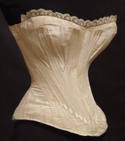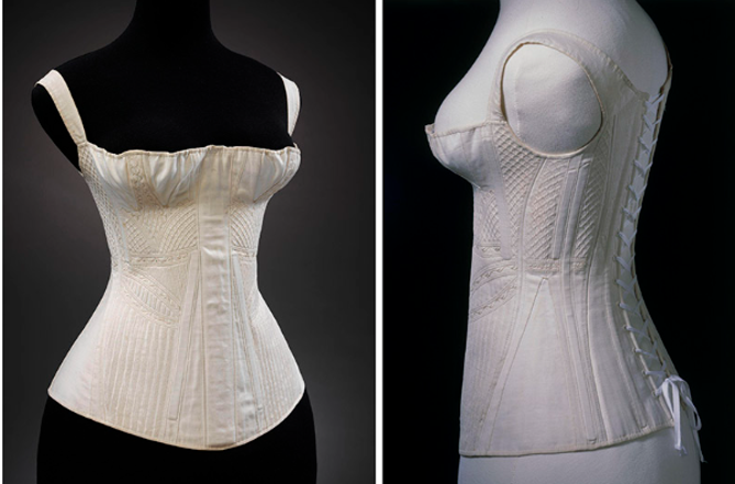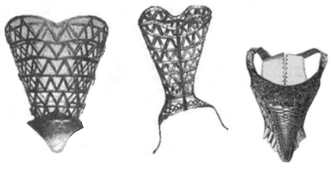 До XV ст. в Бургундії жіночі корсети почали виготовляти зі шкіри з металевими брусками. Для доступу повітря до тіла в корсеті робили круглі отвори. При стягуванні корсета краї отворів врізалися у шкіру і доставляли жінкам жахливі муки. У 1468 році іспанська королева Жуана Португальська винайшла залізний корсет, який стягував фігуру по боках і зачинявся на замок (рисунок 2.10). З допомогою шнурівки вона приховала свою вагітність від чоловіка. В кінці 1470-х років її наступниця Ізабелла I Кастильська зобов’язала своїх служниць носити корсети, який жінки носили до початку XX ст.