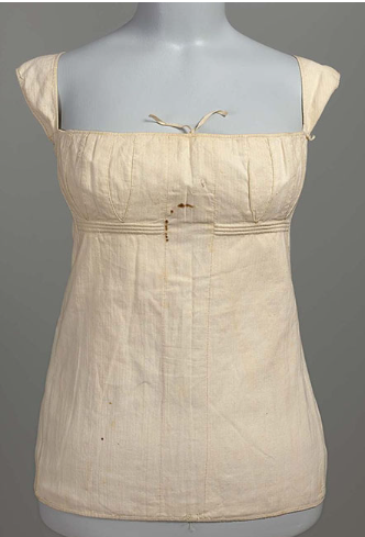 В роки Французької революції в моду входить стиль ампір із завищеною талією, ідеалом якого стали греко-римські зразки одягу з переважанням простоти. На межі XVIII—XIX ст. жіночий корсет значно коротшає та майже зникає з гардеробу. Замість корсету дами носили туалети з глибоким декольте або напівкорсет з еластичних тканин. Груди підтримувались вузьким шарфом, який зав’язувався ззаду навхрест. Ну а те, що у Франції в цю епоху називалося corset, виглядало як короткий жилет, підбитий ватою і без кісточок, зі шнурівкою або застібкою спереду (рисунок 2.14).