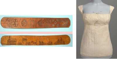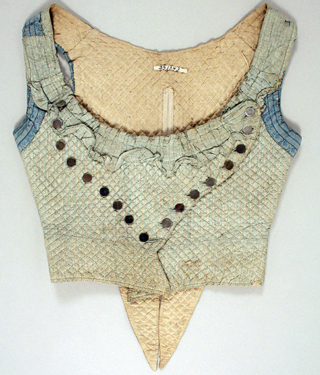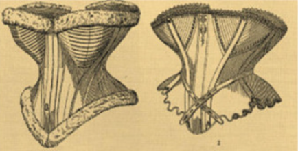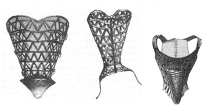 До XV ст. в Бургундії жіночі корсети почали виготовляти зі шкіри з металевими брусками. Для доступу повітря до тіла в корсеті робили круглі отвори. При стягуванні корсета краї отворів врізалися у шкіру і доставляли жінкам жахливі муки. У 1468 році іспанська королева Жуана Португальська винайшла залізний корсет, який стягував фігуру по боках і зачинявся на замок (рисунок 2.11). З допомогою шнурівки вона приховала свою вагітність від чоловіка. В кінці 1470-х років її наступниця Ізабелла I Кастильська зобов’язала своїх служниць носити корсети, який жінки носили до початку XX ст.
