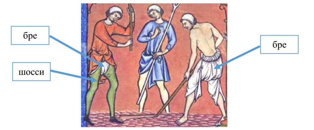 А от функцію чоловічої середньовічної натільної білизни, яка нагадувала сучасні труси, виконували бре — штани з білого або небіленого льону, призібрані на талії і підв’язані шнуром. Поверх них вже надягали шосси — вузькі роз’ємні штани, що кріпилися зав’язками до поясу (рисунок 2.4). В епоху раннього Середньовіччя довжина бре досягала колін, але з плином часу вони коротшали і до XV століття з’явилися бре, що зовні нагадують шорти.