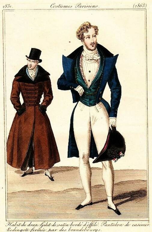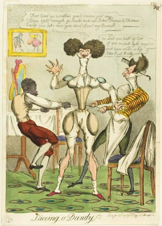 Чоловічий корсет виконував ті ж функції, що й жіночий, хоча й зберіг властивості бронежилету. Корсети стали частиною повсякденного чоловічого гардероба, особливо серед аристократії. Вони допомагали створювати елегантний силует, підкреслити талію та груди. Їх носили під костюмами, які були популярні в ті часи. Й, зазвичай, чоловічі корсети були менш жорсткими, ніж жіночі, та забезпечували більше свободи рухів. На XVIII-XIX століття припадав пік популярності цього предмета гардероба. Відомо, що навіть особи королівської крові, використовували його, щоб виглядати стрункіше. Найбільша популярність прийшла до чоловічого корсета в XIX столітті, коли до моди увійшла постать «денді». Вона передбачала осину талію, яка, підкреслювала широкі плечі. Чоловікам, що одягали фрак та білі панталони, потрібно було ховати відкритий для огляду живіт, тому вони тягли його корсетом (рисунок 2.16).