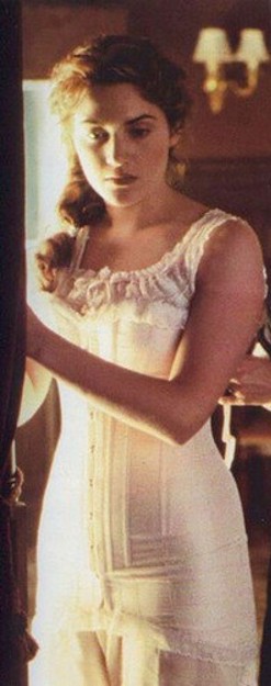 На межі XIX-XX ст. вузька талія та пишні груди сформували S-подібний силует, який надав жіночій фігурі вигнутих образів. Корсет поступово подовжувався до колін, поверх якого надягали ще один ліф та нижню спідницю. З того часу корсети почали шити із еластичних тканин. Подібний корсет був на героїні фільму «Титанік» (рисунок 2.23).