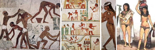 Існували й пов’язки на стегнах, що зовні нагадують сучасну білизну: в той час, як широка частина полотна прикривала сідниці і перев’язувалася кінцями на талії, вужчу частину пропускали між ніг і зав’язували аналогічним чином. Шкіряну пов’язку на стегнах подібного типу, яка, ймовірно, прийшла в Єгипет з Нубії, часто одягали поверх пов’язки з тканини. Жінки закривали стегна вузьким поясом, до якого кріпилася пропущена між ніг тканина — подібним чином одягнені танцівниці і рабині на єгипетських фресках (рисунок 2.1).