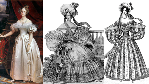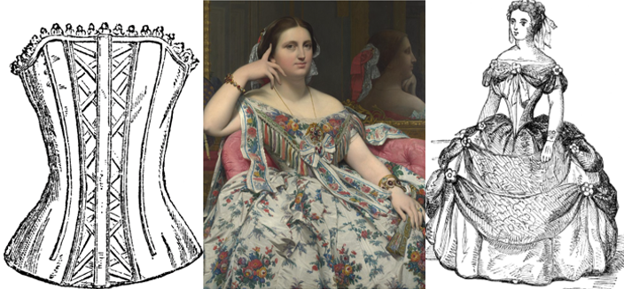 Ближче до 1840 року пишні рукава поступаються місцем покатим плечам, а намагання зробити талію ще вужчою призводить до появи тугого стягуючого корсету, в який вшивають металеві пластини (рисунок 2.21). Такі корсети крім створення тонкого силуету, мали тримати масивні важкі спідниці з криноліном (який кріпився безпосередньо до корсету).