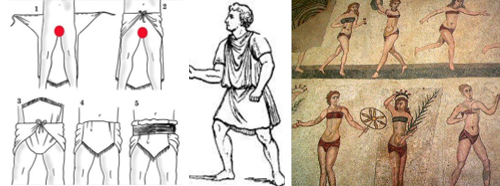 Роль натільної білизни грала туніка, а вже поверх неї римляни надягали плащ або тогу. Римлянки, щоб здаватися стрункішими, бинтували груди і стегна, а, займаючись спортом, надягали шкіряні пов’язки і нагрудні пов’язки, прототипи сучасного бюстгальтера. Нижня білизна Стародавнього Риму – це свого роду пов’язка на стегнах, яку носили і чоловіки, і жінки (рисунок 2.2).