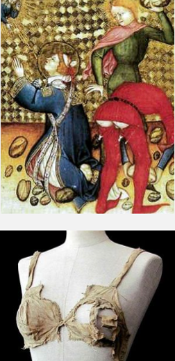 Коли в точності з’явилася нижня білизна, сказати важко. Деякі дослідники вважають, що десь у 1150 р., проте доказів цьому немає. На мініатюрі «Мучеництво св. Стефана» (Франція, XIV ст.) у середньовіччі кальсони вже були нижньою білизною (рисунок 2.7). Середньовічні бюстгальтери викликали неоднозначну реакцію. Є кілька письмових середньовічних джерел, які свідчать про існування пристосувань для підтримки жіночих грудей. Лікар французького короля Філіпа Справедливого і його наступника Людовика X Анрі де Мондевиль (Henri de Mondeville) писав у своїй «Хірургії» в 1312-1320 роках: «Деякі жінки… вставляють у свої сукні два мішечки за розміром і формою грудей, які щільно до них прилягають. Щоранку вони вставляють їх (груди) в ці мішечки, які при можливості закріплюють відповідною за кольором стрічкою».