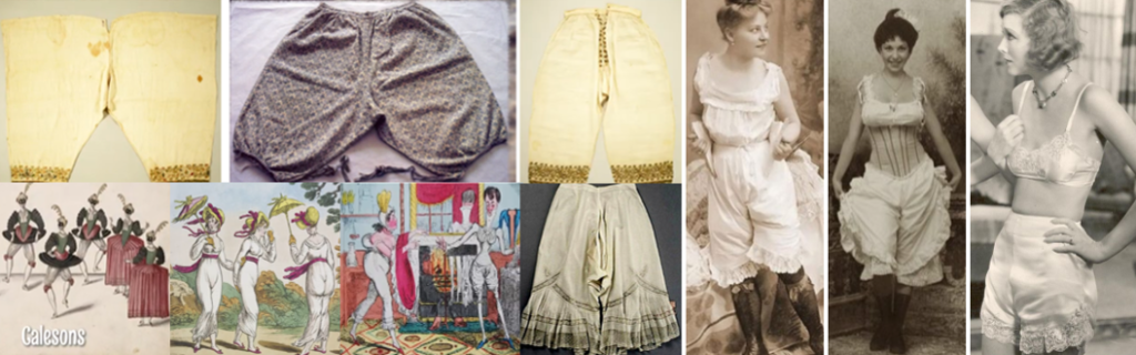Але відомо і те, що в XVI столітті деякі італійські жінки все ж носили панталони: Елеонора Толедські (1522-1562) носила одну пару в 1561 році. Через півстоліття вже багато пар було виготовлено для Марії Медичі (1573-1642), яка була у той час новою королевою Франції. Жінки в Голландії також носили панталони, Морісон розповідає: «Деякі старші жінки, які не в силах переносити мороз, надягають знизу штани з льону або шовку». На посмертному зображенні Єлизавети I, зробленому в 1603 році, вона в корсеті і панталонах. До того ж є згадка про те, що у Єлизавети було «шість пар полотняних подвійних штанин з тонкої голландської тканини», зшитих в 1587 році. На початку XIX століття панталони остаточно утвердилися в жіночому гардеробі: оброблені мереживом, спочатку вони досягали щиколотки, а потім укоротилися до середини ікри. Відмітна особливість крою перших штанів — роздільні штанини, які кріпилися до поясу на талії, залишаючи шов на рівні промежини відкритим. У 1860-х роках панталони стали ще коротше і доходили тільки до колін (рисунок 2.8).