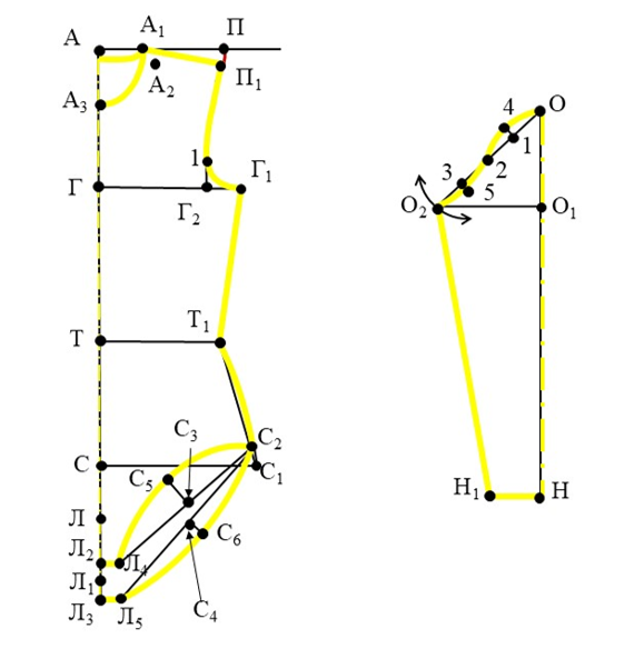 Із точки О провести дугу R = ОО2 = П1Г1 ( з креслення спинки/переду) + 1,0 = 16,5 + 1,0 = 17,5