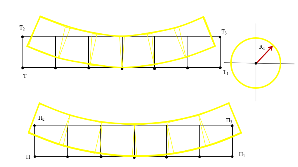 Відрізок ТТ1 розділити на 6 частин, відповідно поставити точки 1,2,3,4,5, через них провести вертикальні лінії.