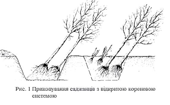 Технологія прикопування. Спочатку викопують траншею шириною 0,8–1,5 м, глибиною 50–60 см – для дерев і 40-45 см – для чагарників. Потім щільно в один ряд викладають рослини, засипають пухкою землею (корені рослин), ущільнюють та періодично поливають.