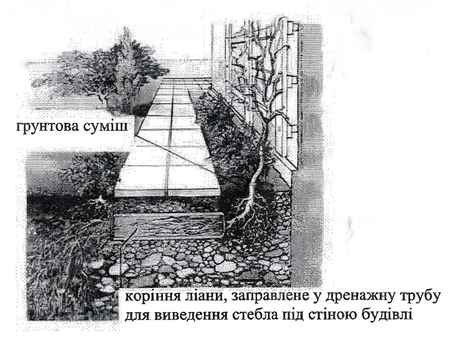 Ліани висаджують в ями або траншеї глибиною не менше 50 см і шириною 50–60 см в поживний рихлий грунт на відстані 30–40 см від опори, оскільки безпосередньо біля самого фундаменту грунт зазвичай швидко пересихає. Кореневі системи ретельно розправляють в ямі та засипають рослинною землею. Кожний насипаний шар землі обережно ущільнюють. Пагони рослин закріплюють на каркасі м’якими шнурами (кокосовими чи полімерними) або спеціальними пластиковими кліпсами.