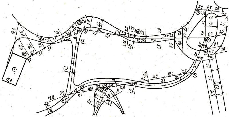 • контури майданчиків – в кутках і в точках перетину їх з алеями та доріжками;