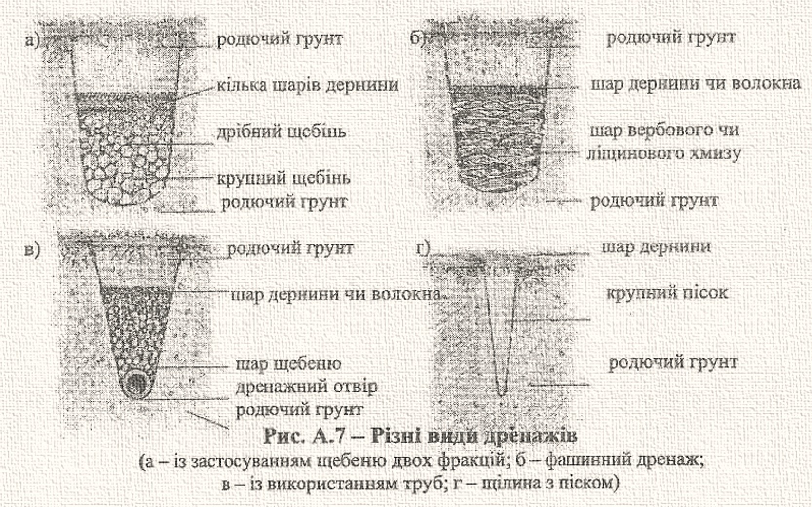 Для влаштування дренажу застосовують інертні матеріали – гравій, щебінь, великозернистий пісок. За глибокого закладання дрен використовують також дренажні труби (керамічні, цементні, пластикові тощо). Використання пластикових неперфорованих труб передбачає висвердлювання в них отворів діаметром 8–12 мм в кількості 40–60 шт на метр пог. Діаметр дренажних труб залежить від повздовжнього нахилу дрен. За нахилу 0,005–0,01 діаметр труби має бути в межах 100–200 мм; за нахилу 0,003 – 200–300 мм.