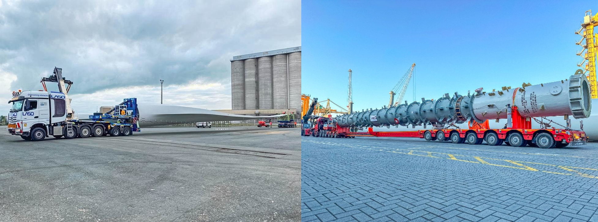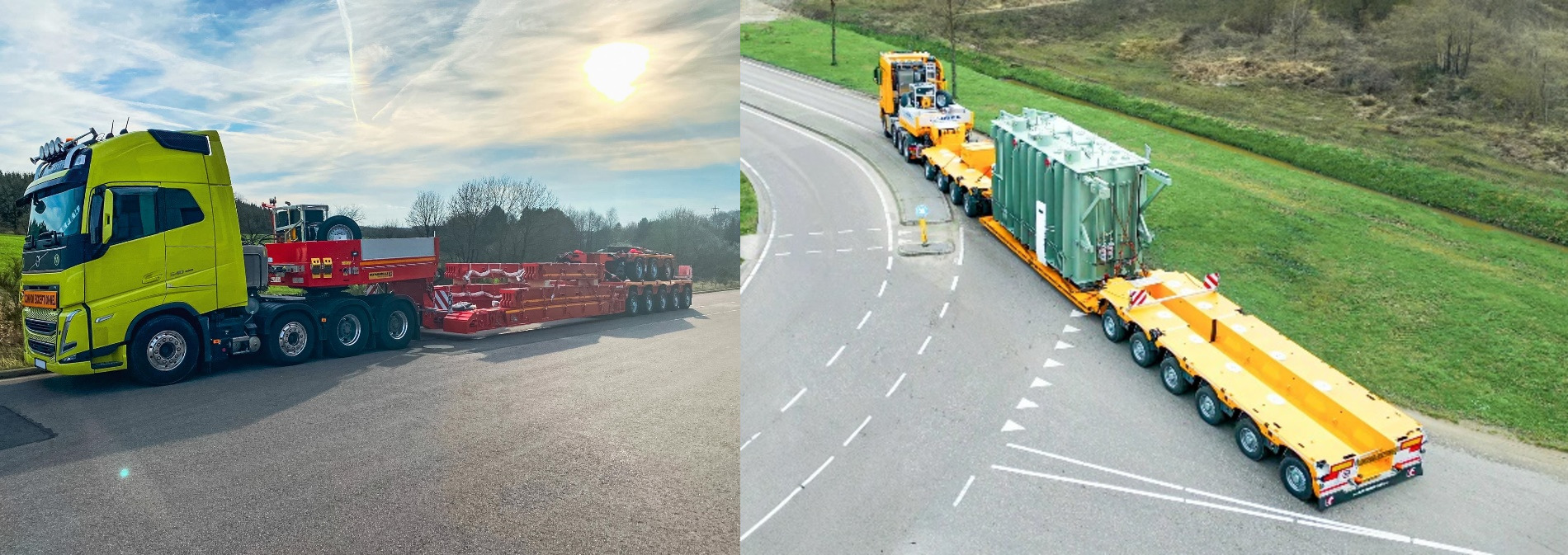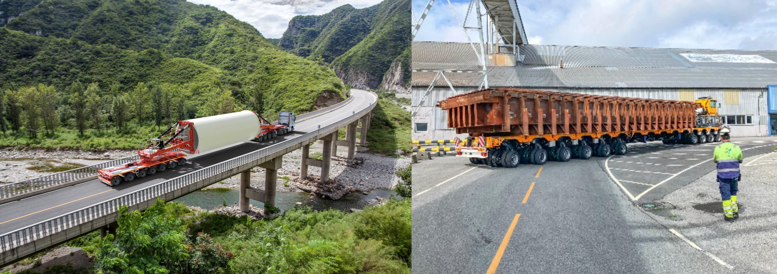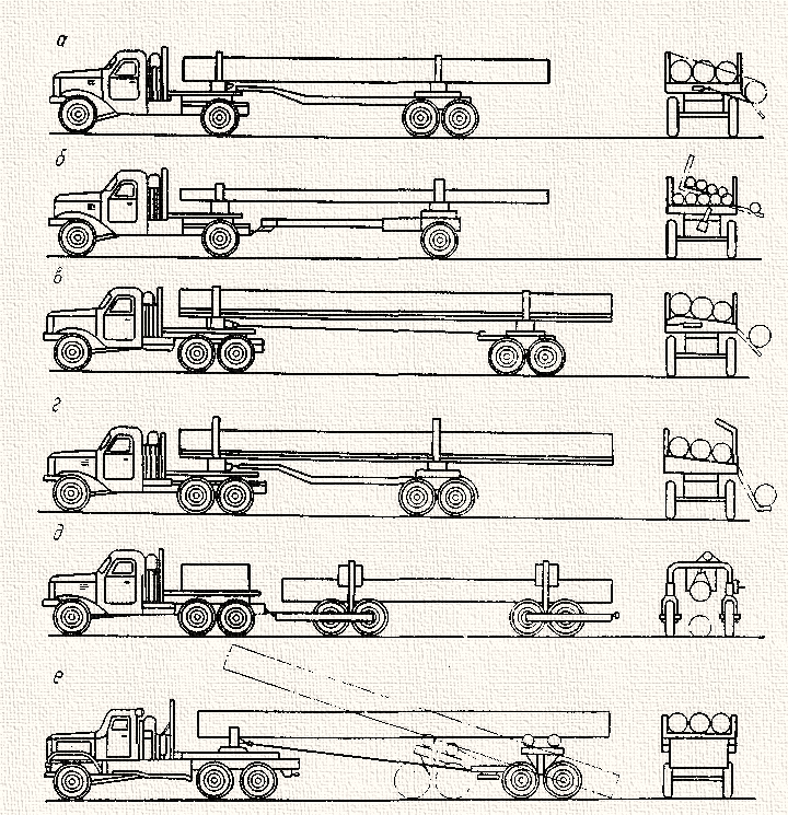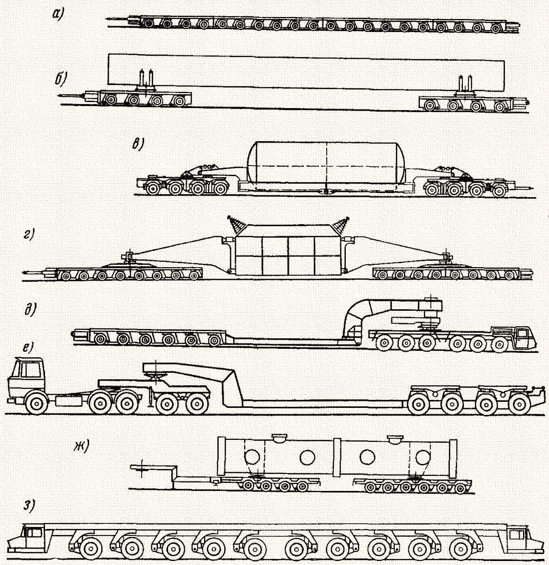а – 20-осний причіп із платформою над колесами; б – 8-осний причіп-розпуск із кониками; в – 8-осний причіп із платформою між колесами; г – 16-осний безплатформний причіп з консольною рамою; д – 12-осний автопоїзд із вигнутою низько розташованою рамою напівпричепа; е – 9-осний автопоїзд із вигнутою низько розташованою рамою напівпричепа і підкатним візком; ж – 4-осний напівпричіп з вигнутою низько розташованою рамою і 6-осний причіп із платформою над колесами; з – 10-осний самохідний (з мотор-колесами) автопоїзд із платформою над колесами вантажопідіймальністю 1700 т