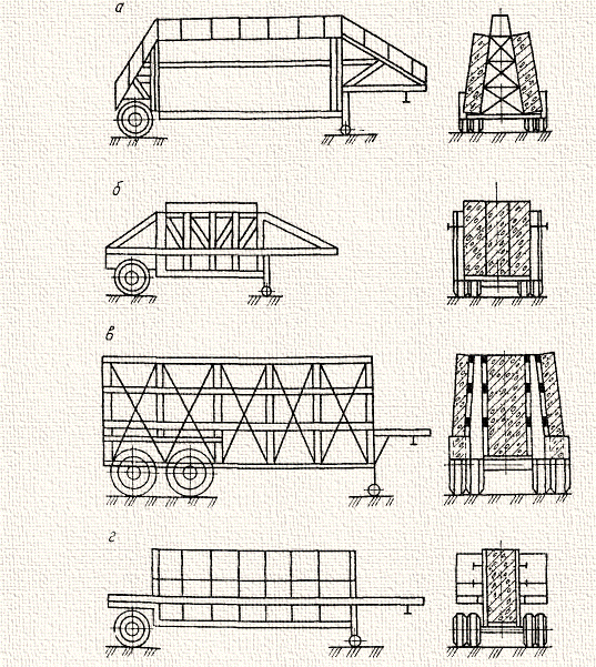 Конструкції основних вузлів напівпричепів для перевезення залізобетонних виробів, переважно, мають подібні схеми. Основні типи панелевозів наведено на рисунку 3.71.