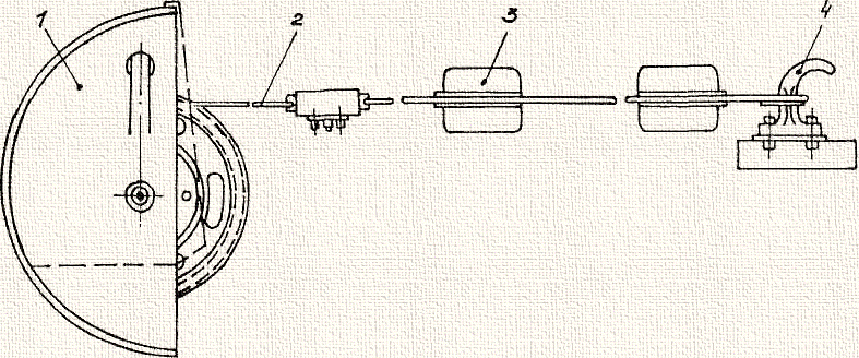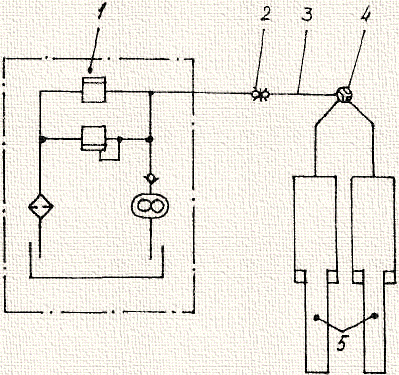 1 – гідрообладнання автомобіля-тягача; 2 – запірний пристрій; 3 – лінія зв’язку; 4 – запірний кран; 5 – гідроопора