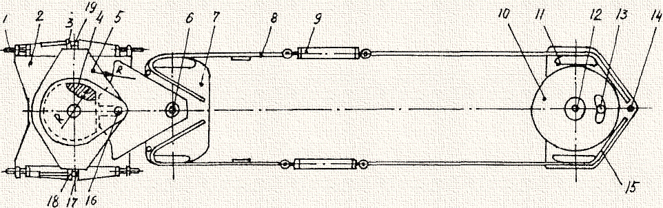 Рисунок 3.75 – Поворотний пристрій напівпричепа-панелевоза: 1 – гвинт; 2 – основа упорів; 3 – правий упор; 4 – шворінь повідця; 5 – повідець; 6 – шворінь середнього блока; 7 – середній блок; 8, 15 – троси; 9 – стяжка; 10 – задній блок; 11 – сектор; 12 – шворінь заднього блока; 13 – упор обмеження повороту; 14 – стопор; 16 – палець повідця; 17, 19 – ролики повідця; 18 – лівий упор
