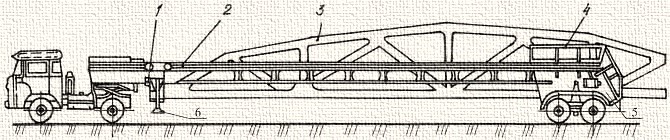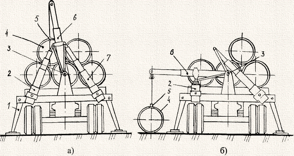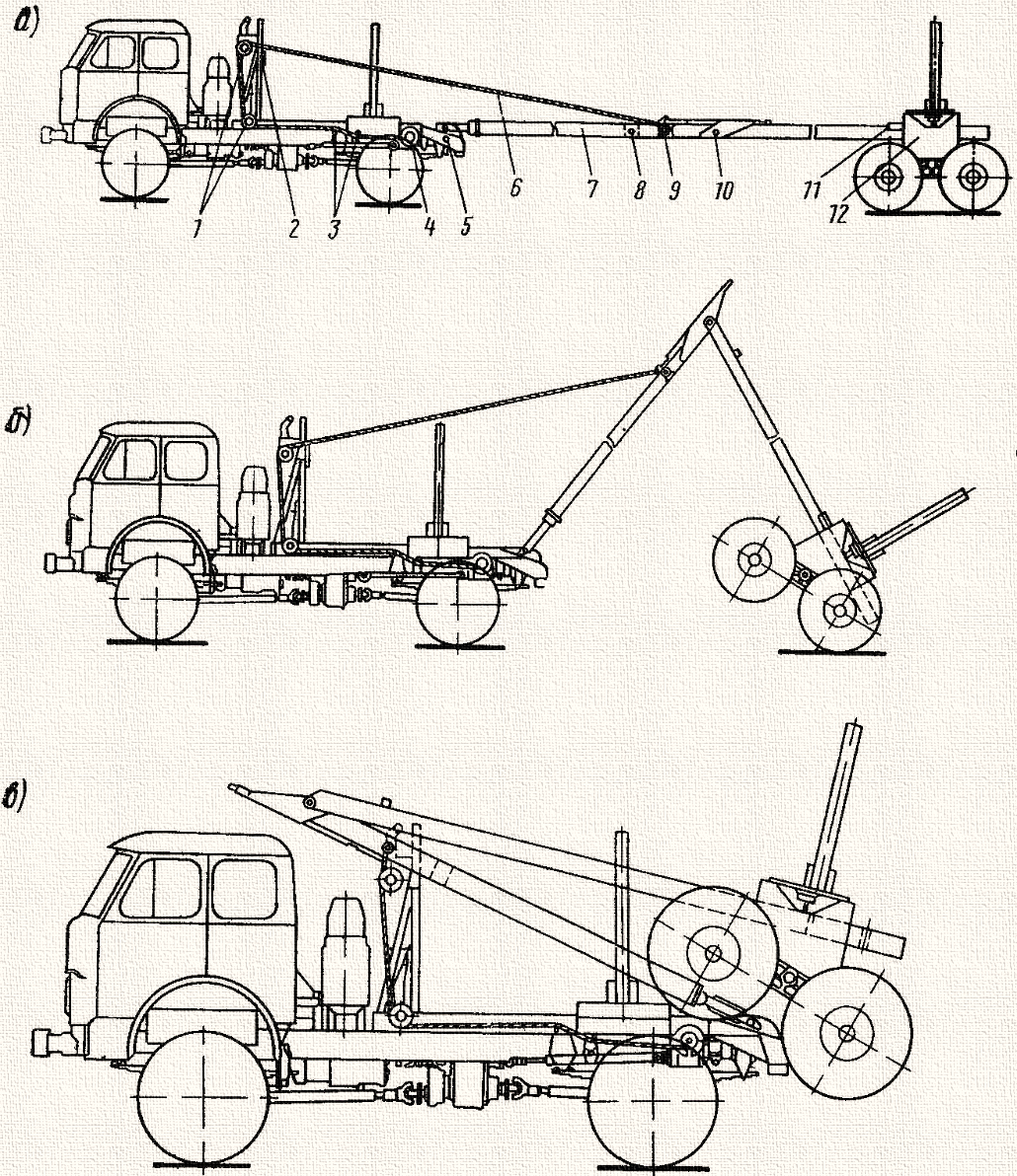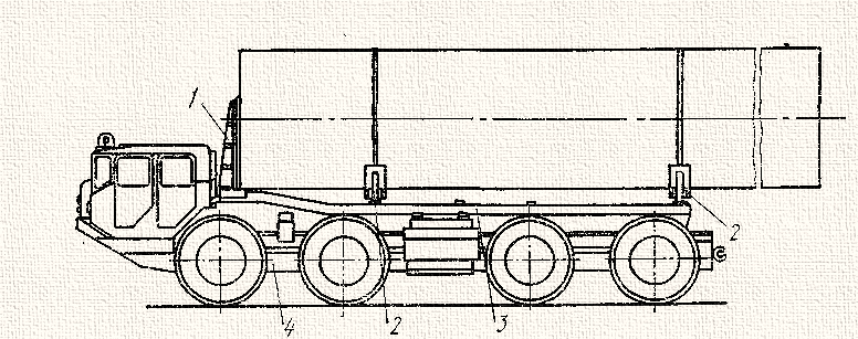 На рисунку 3.78 показаний трубовоз з колісною формулою 8×8 вантажопідіймальністю 15 т для перевезення труб завдовжки до 12 м. На рамі 4 автомобіля встановлений надрамник 3 і запобіжний щит 1. На надрамнику закріплено два коники 2 із гвинтовими механізмами і канатно-блоковою системою для кріплення (ув’язування) труб, що укладають на кониках трубовоза до упора в запобіжний щит.