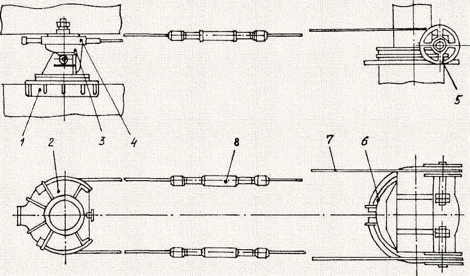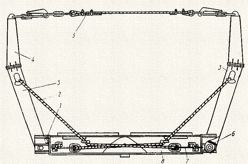 Пристрій складається з повздовжніх тросів 8, 15, які передніми кінцями закріплені до середнього блока 7, що перебуває в зачепленні з повідцем 5, а задніми кінцями – до блока 10, що закріплений на візку.