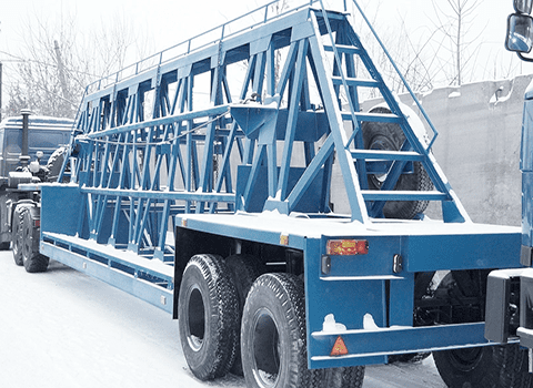 Для перевезення труб завдовжки до 12 м незначної вантажопідіймальності на невеликі відстані використовують спеціалізовані напівпричепи з запобіжним щитом, чотирма кониками і канатно-блоковою системою для кріплення (ув’язування) труб (рисунок 3.79).