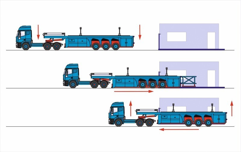 Так, наприклад, у напівпричепа-ваговоза FAYMONVILLE ModulMAX AP-M: The 3-in-1 для навантаження важкого неподільного вантажу платформа може бути опущена за допомогою гідросистеми протягом 2 хв, а візки від’єднані від платформи. Рама візка має порожнини для встановлення гідравлічних піднімальних механізмів подвійної дії з урухомленням від насоса, що створює тиск робочої рідини 30 МПа. Навантажувальна висота за опущеної платформи становить 500 мм, за піднятої платформи без навантаження – 900 мм, під навантаженням – 850 мм.