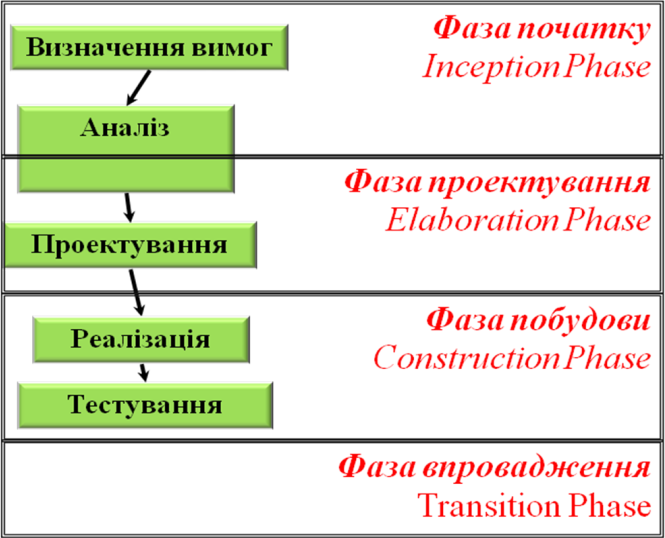 Уніфікований процес розроблення    ПЗ       передбачає розподіл ЖЦ програмного забезпечення на фази (рис.27).